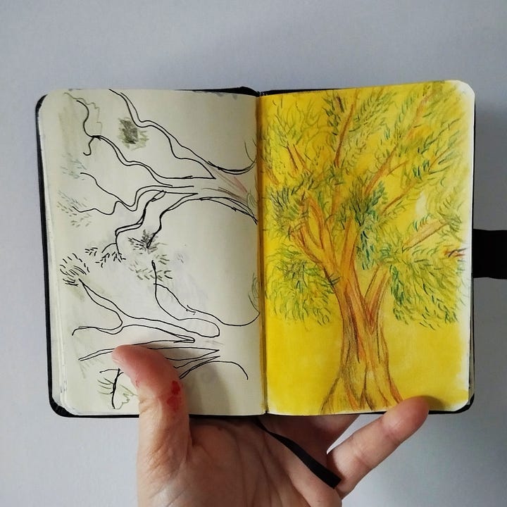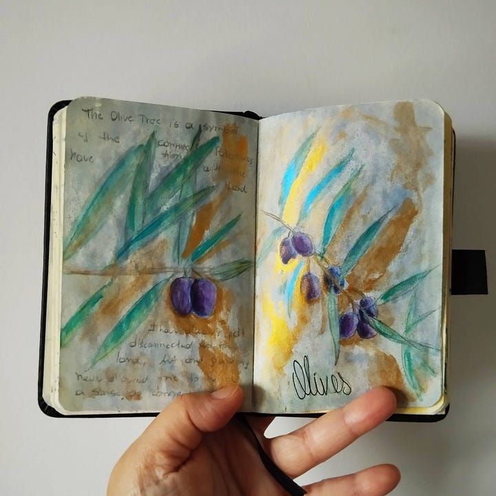 But despise it all, when a bit of inspiration hits, I been filling the pages of my sketchbook. I am particularly inspired by the beautiful connection the Palestinians have with the ancestral land and their olives trees.